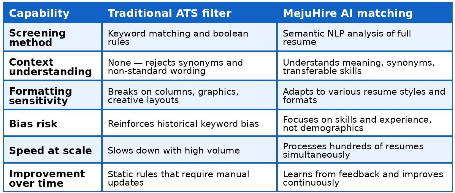 Traditional ATS keyword filters have well-documented limitations. According to industry research, up to 75% of qualified resumes can be rejected by older ATS systems due to formatting issues or missing keywords — not because the candidate lacks the right skills. Keyword matching also cannot distinguish between a senior manager at a multinational and a similar title at a two-person startup, because it does not understand context.
