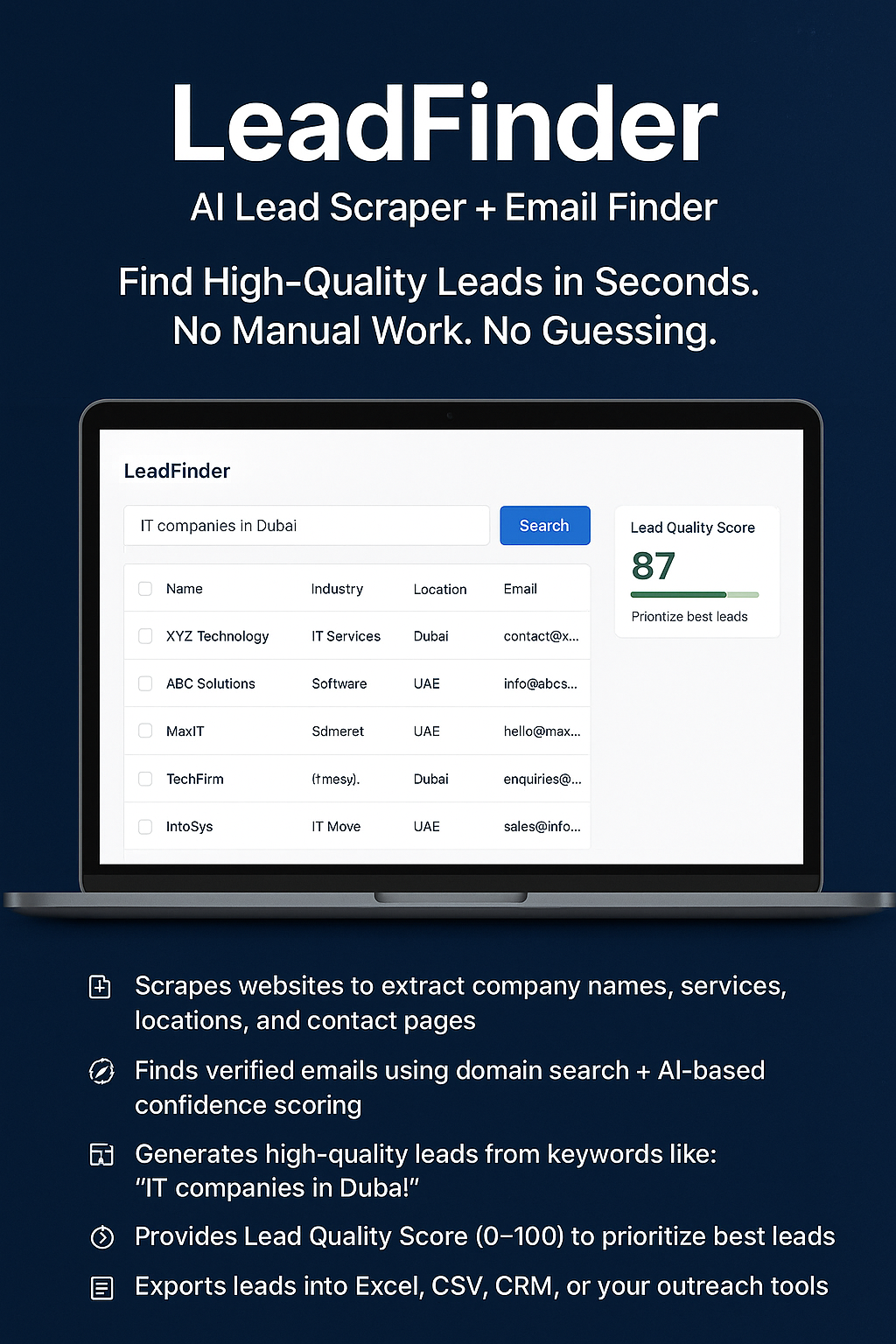 LeadFinder is a smart AI-powered lead generation tool that helps businesses, freelancers, and agencies instantly discover potential customers from anywhere on the internet.